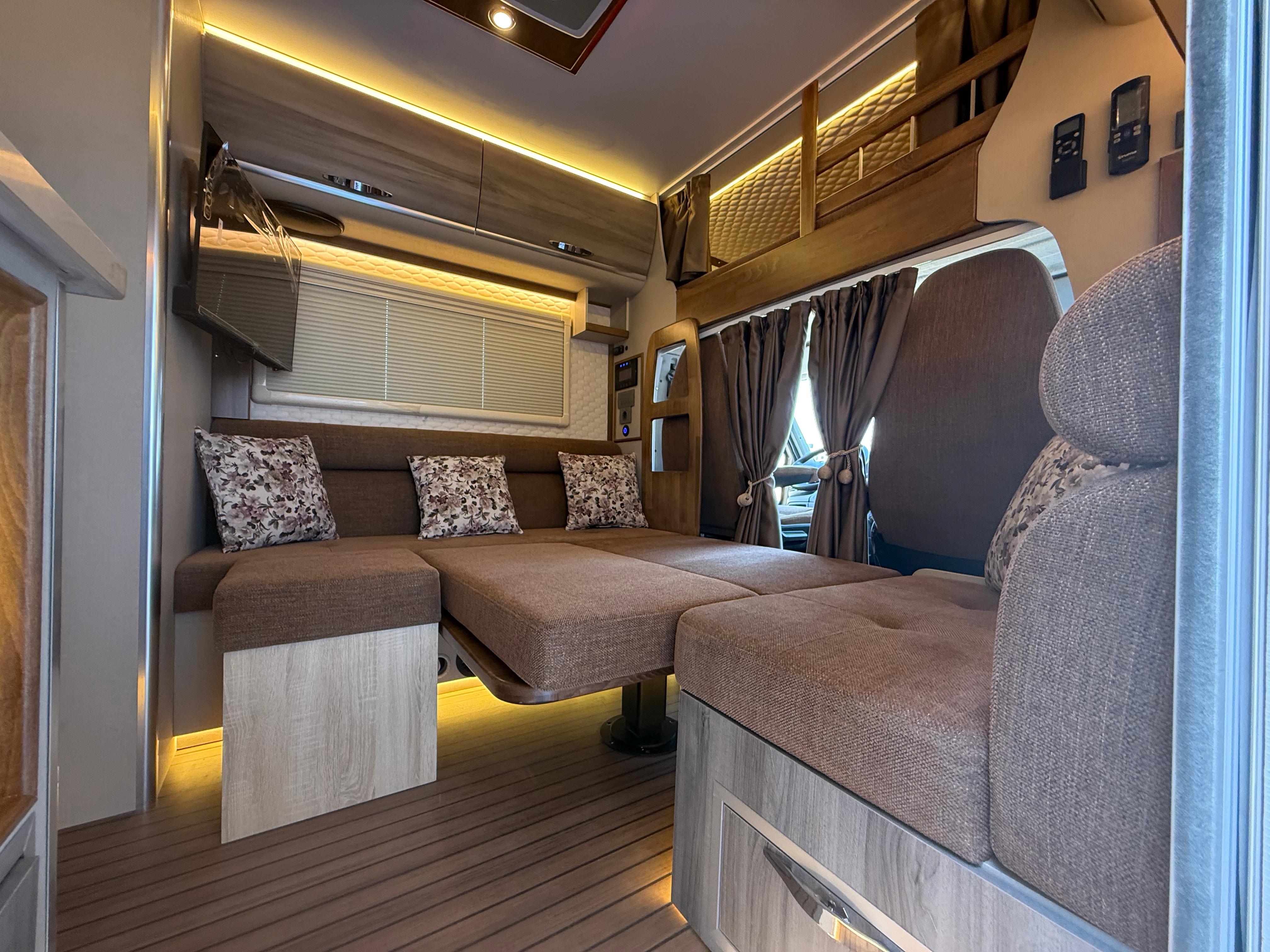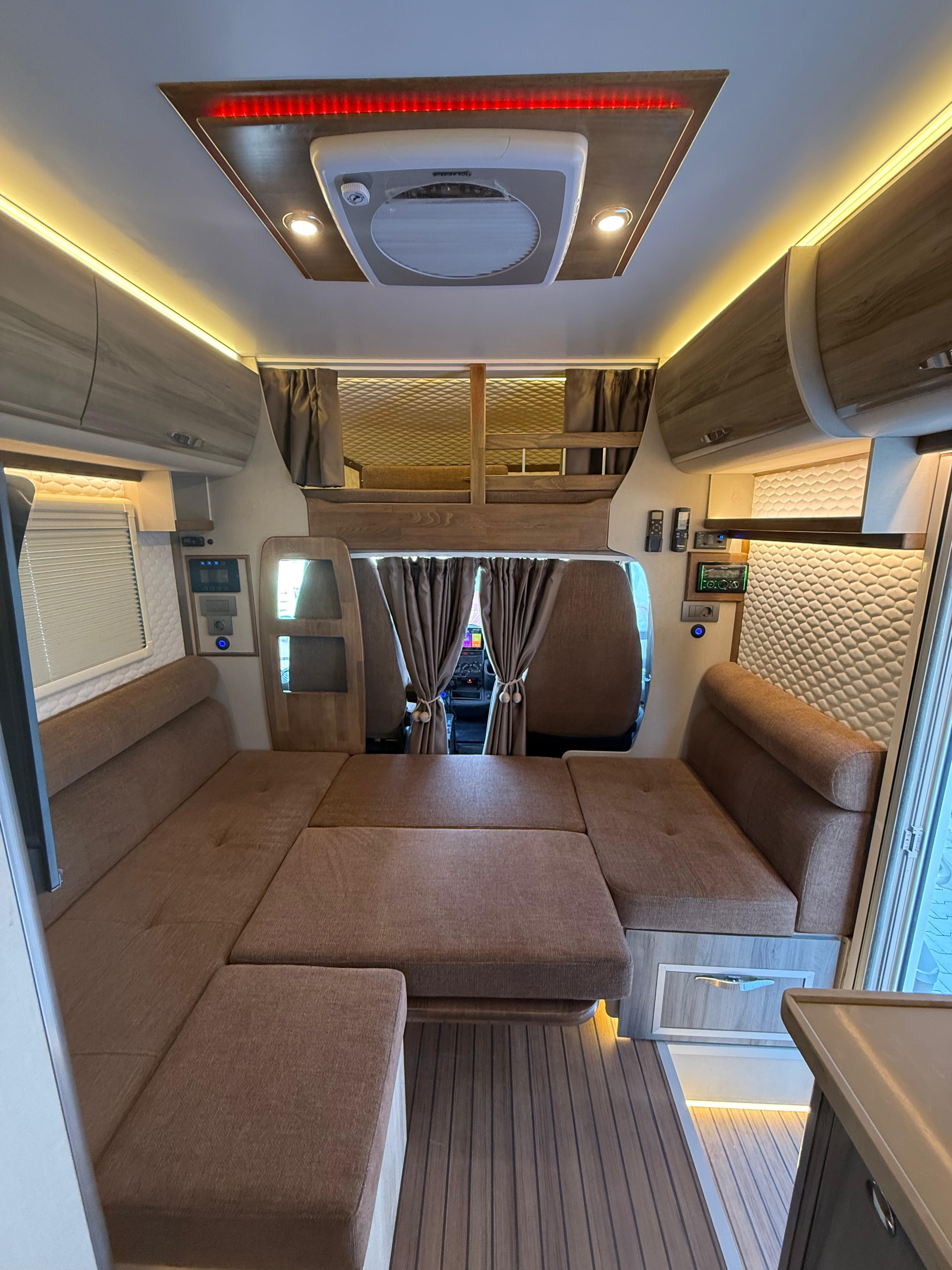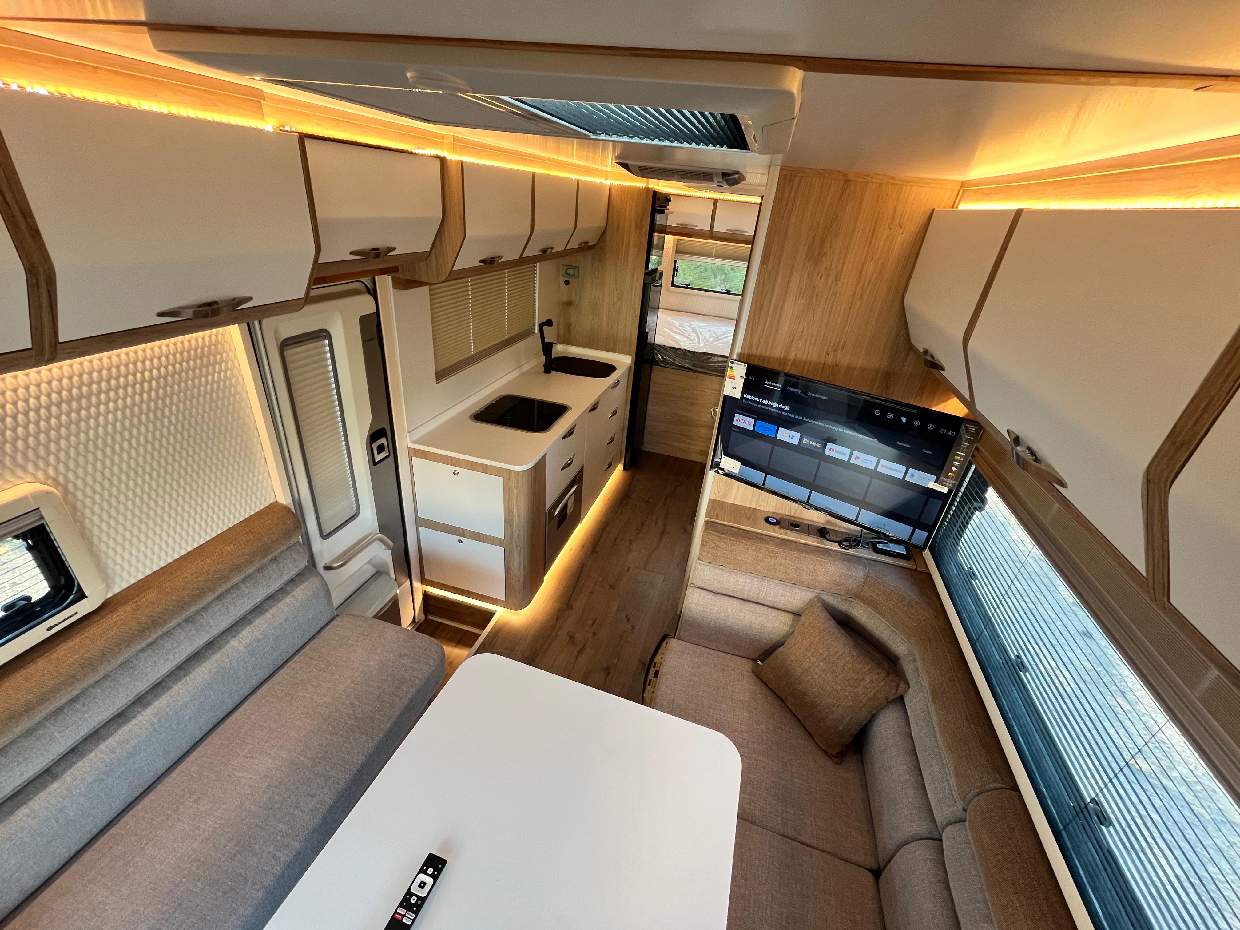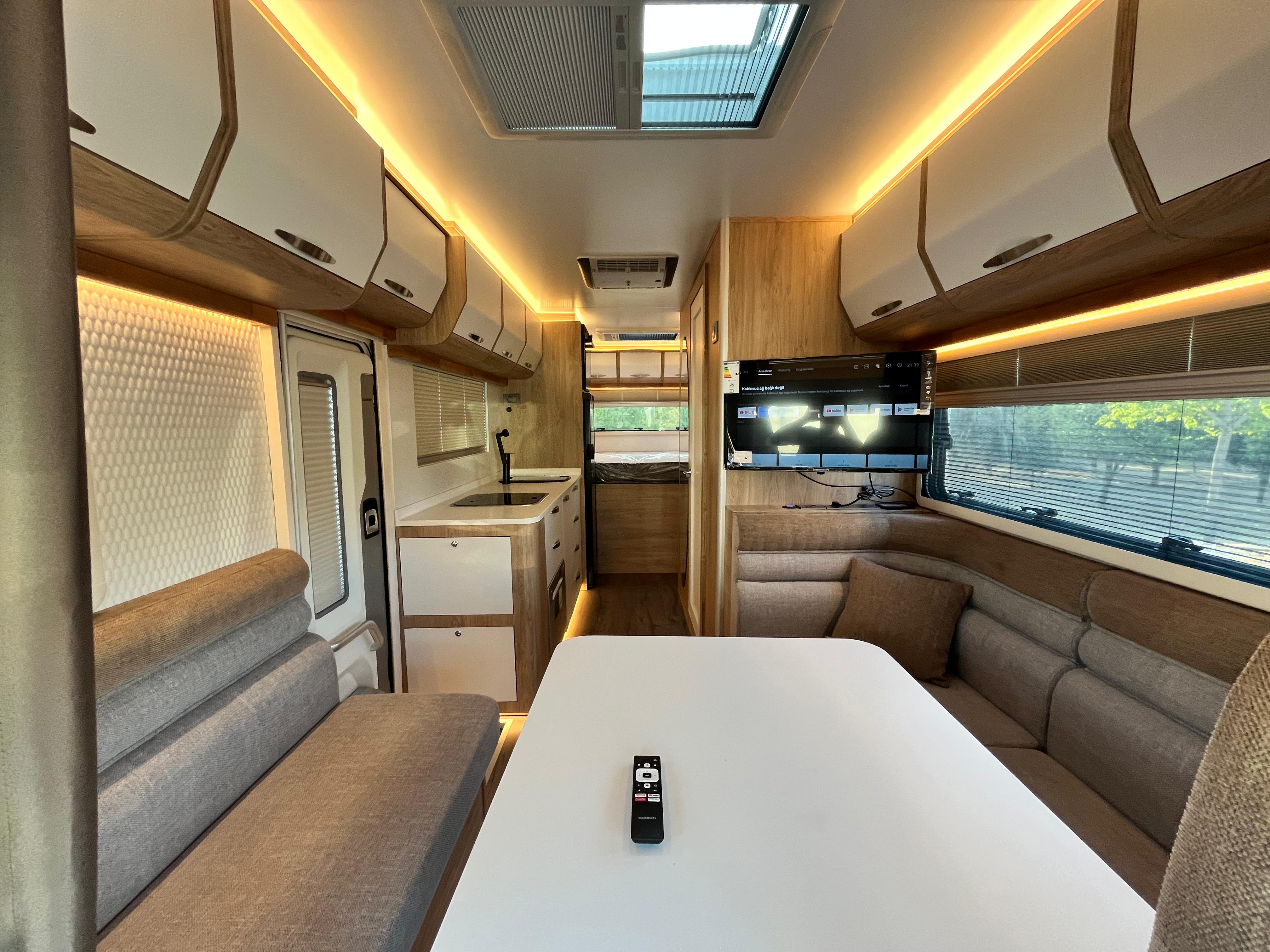 Gezginci Model, yüksek tavan yapısı, geniş camları ve ferah iç mekan düzenlemesiyle, doğayı ve manzarayı her an yaşama fırsatı sunar. Özel olarak tasarlanan iç mekan, tam donanımlı mutfağı, oturma alanı ve uyuma bölmesiyle bir evin konforunu sunar. Ayrıca, teknik donanımı sayesinde her türlü yol koşuluna uyum sağlar ve güvenli bir sürüş deneyimi sunar.