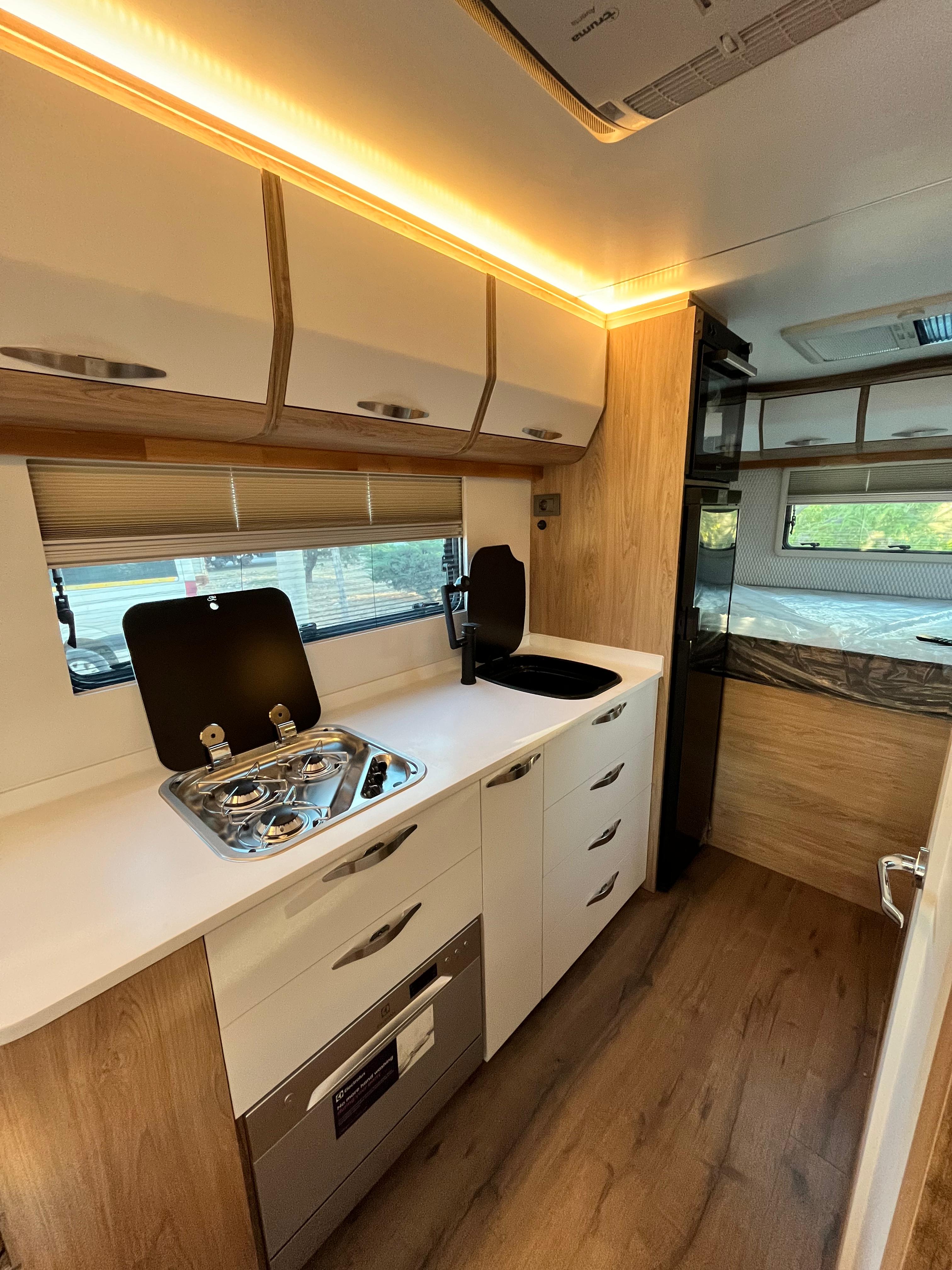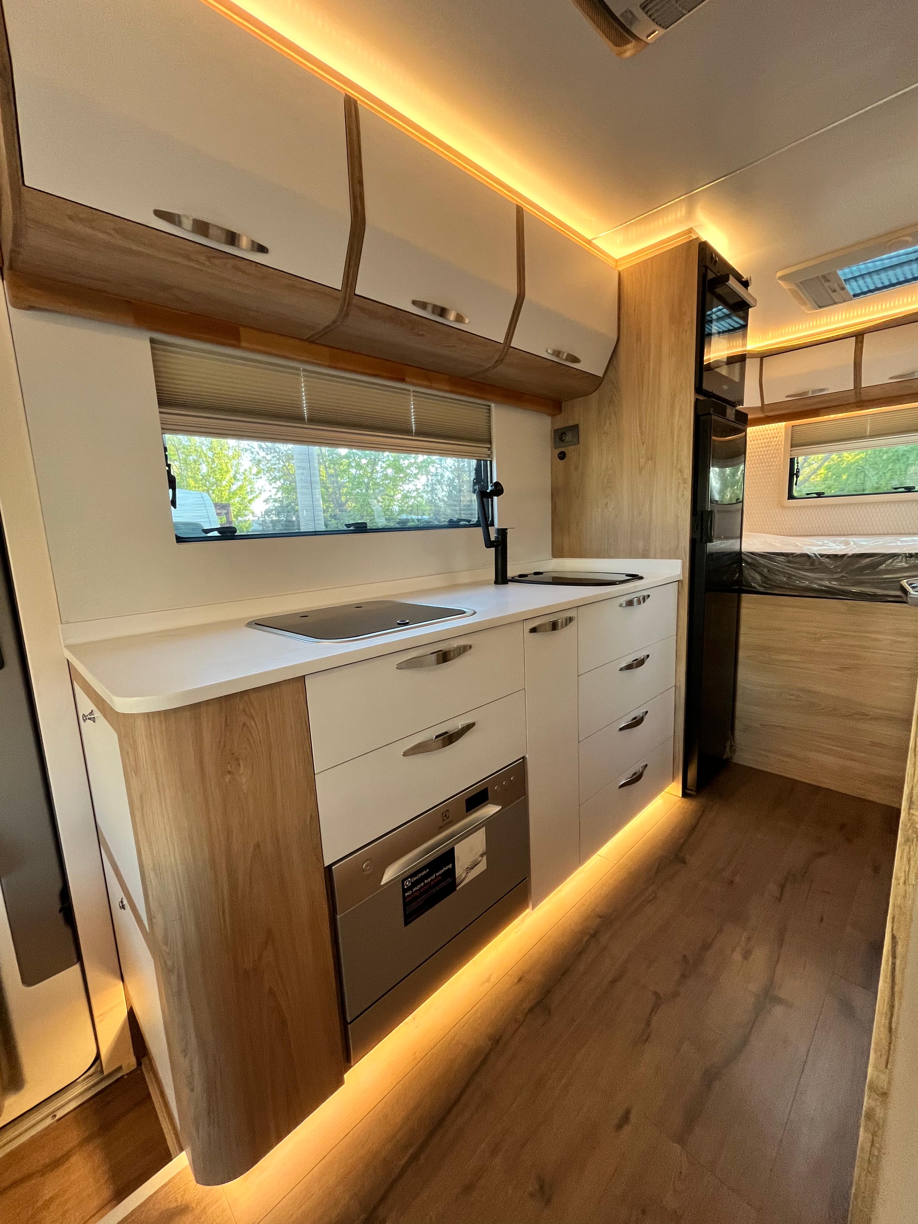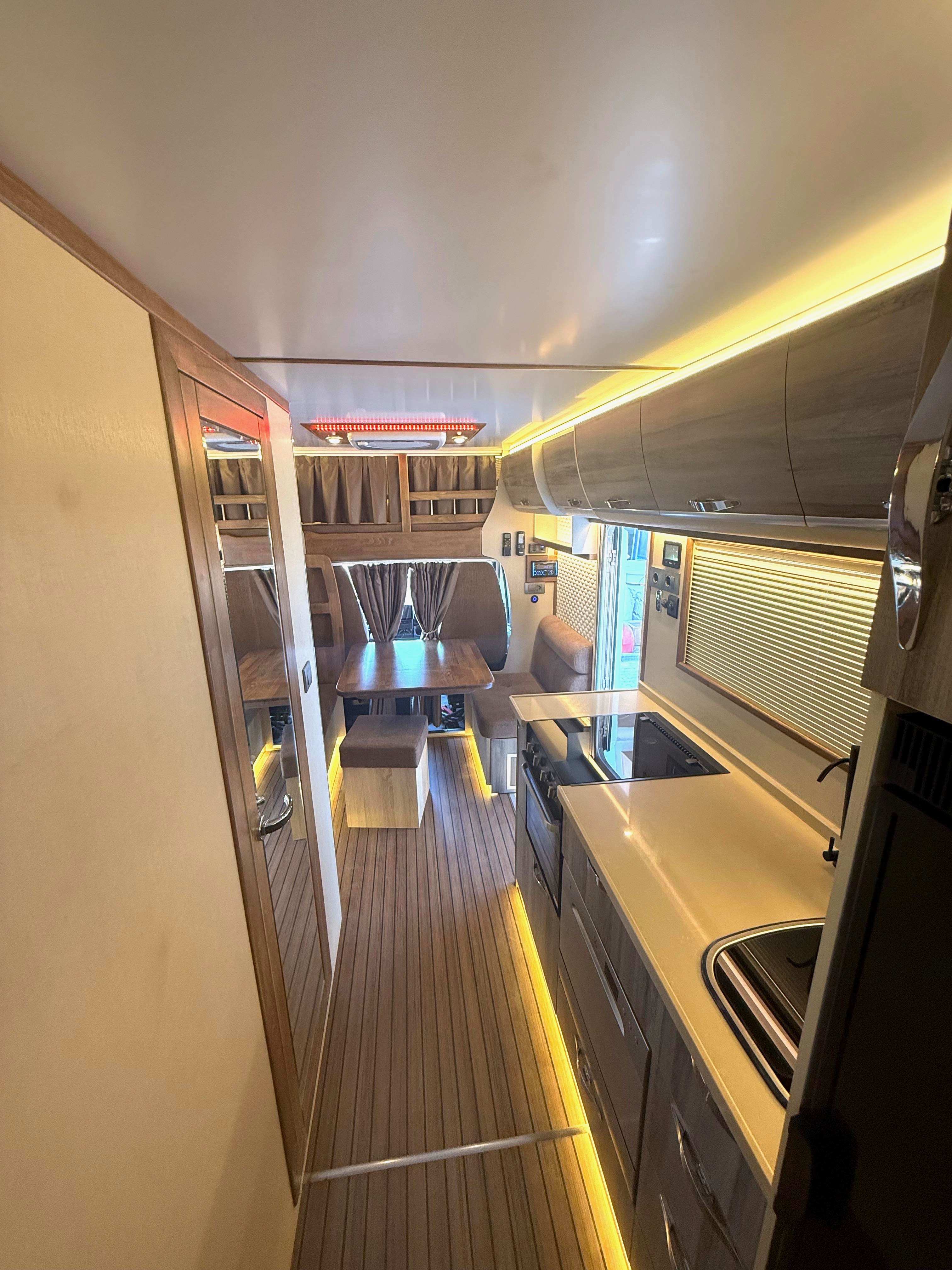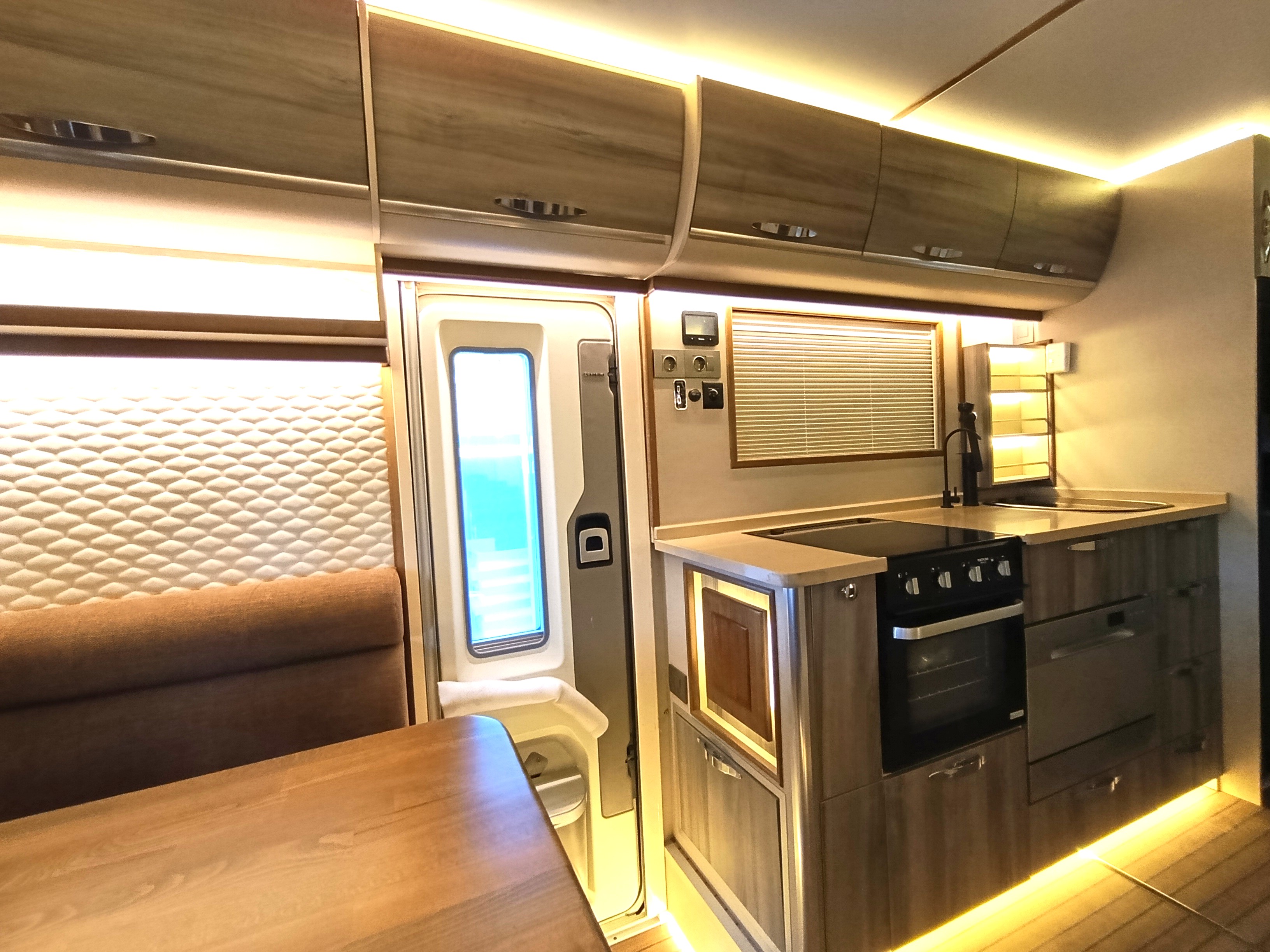 Gezginci Model, yüksek tavan yapısı, geniş camları ve ferah iç mekan düzenlemesiyle, doğayı ve manzarayı her an yaşama fırsatı sunar. Özel olarak tasarlanan iç mekan, tam donanımlı mutfağı, oturma alanı ve uyuma bölmesiyle bir evin konforunu sunar. Ayrıca, teknik donanımı sayesinde her türlü yol koşuluna uyum sağlar ve güvenli bir sürüş deneyimi sunar.