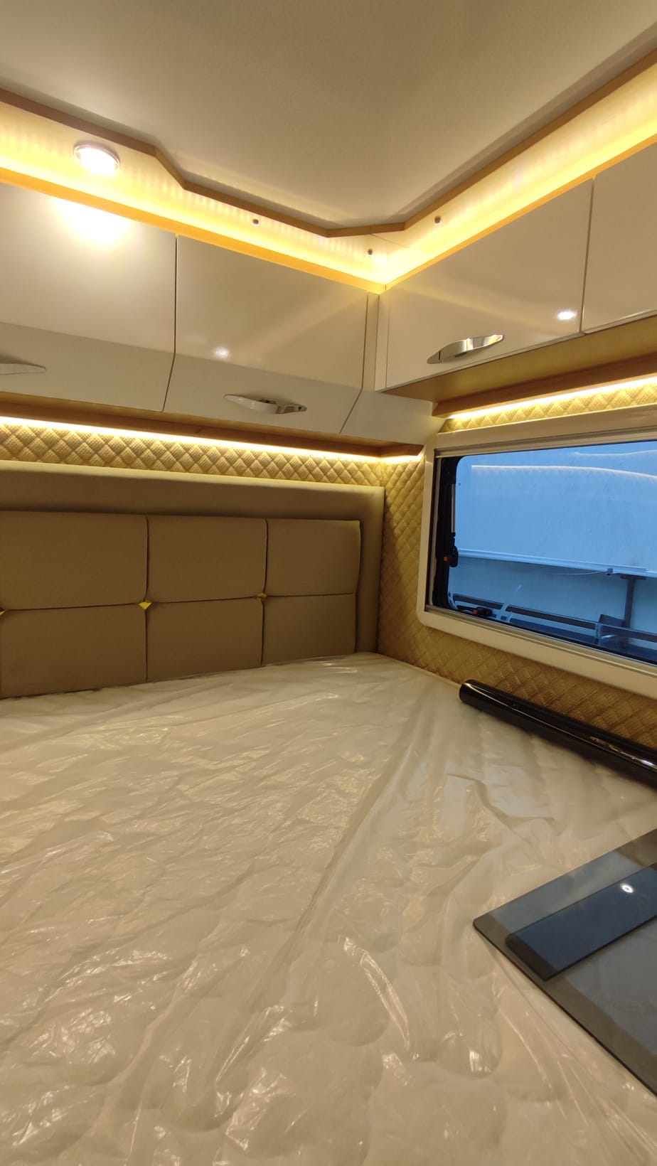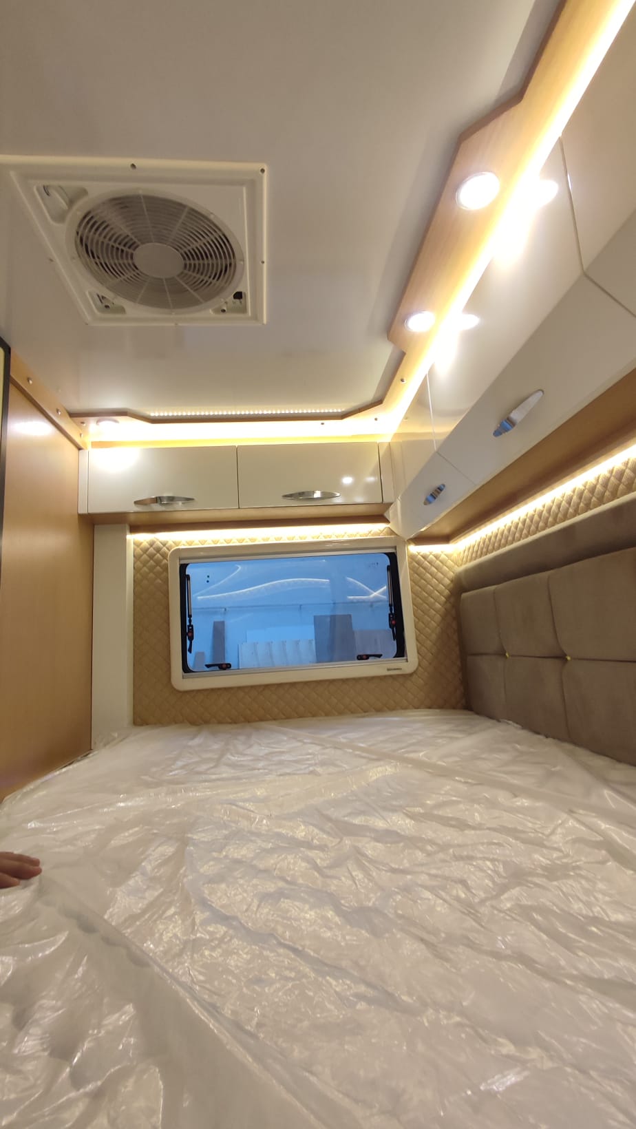 Alkoven Model, geniş iç hacmi, yüksek tavanı ve büyük pencereleriyle ferah bir yaşam alanı sunarken, ön kısımda yer alan alkoven bölmesi ek bir uyku alanı sağlayarak daha fazla kişinin rahatça konaklamasına imkan tanır. İç mekan, tam donanımlı mutfağı, oturma ve yemek alanı, banyo ve konforlu uyku bölmeleriyle seyahat ederken ev rahatlığını sunar.